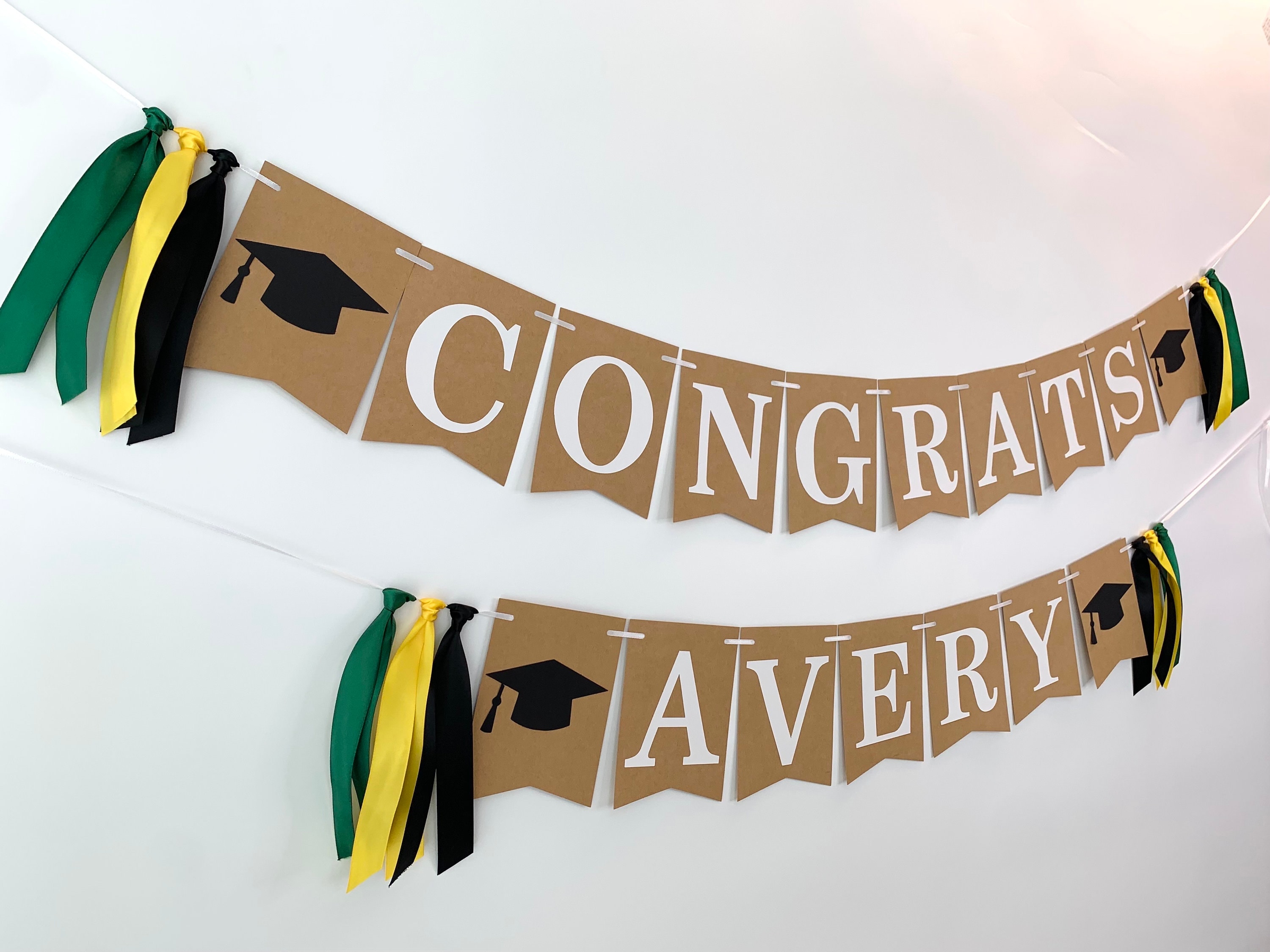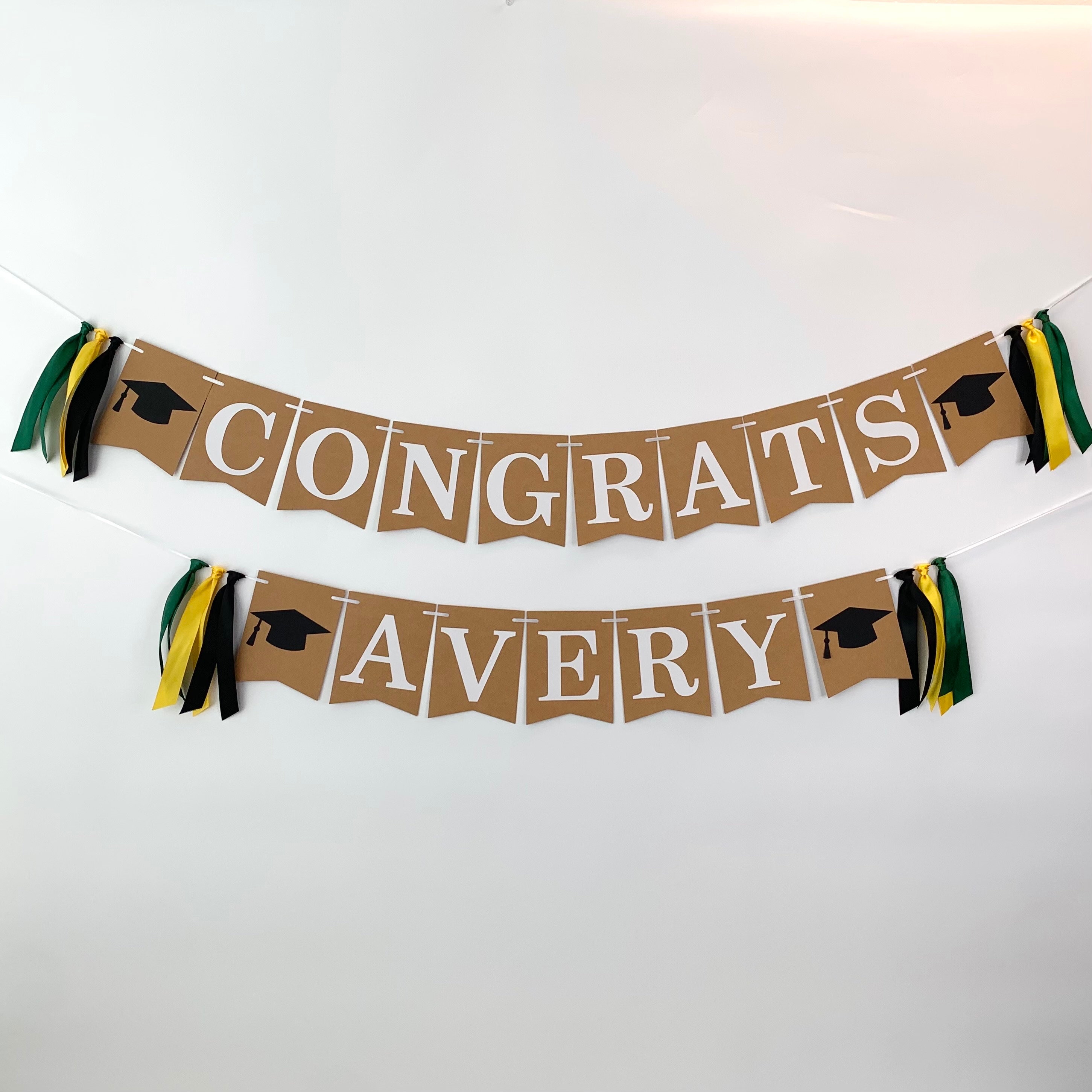 Dieses Angebot betrifft ein selbstgemachtes Abschlussbanner mit dem Satz „Herzlichen Glückwunsch …“ und dem Namen des Absolventen. Am Ende jeder Reihe befinden sich Abschlusskappen und Bänder in der Farbe Ihrer Schule. Das Banner ist im Wimpelstil gehalten und verfügt über kleine Wimpel für jeden Buchstaben und Abschlusskappen.