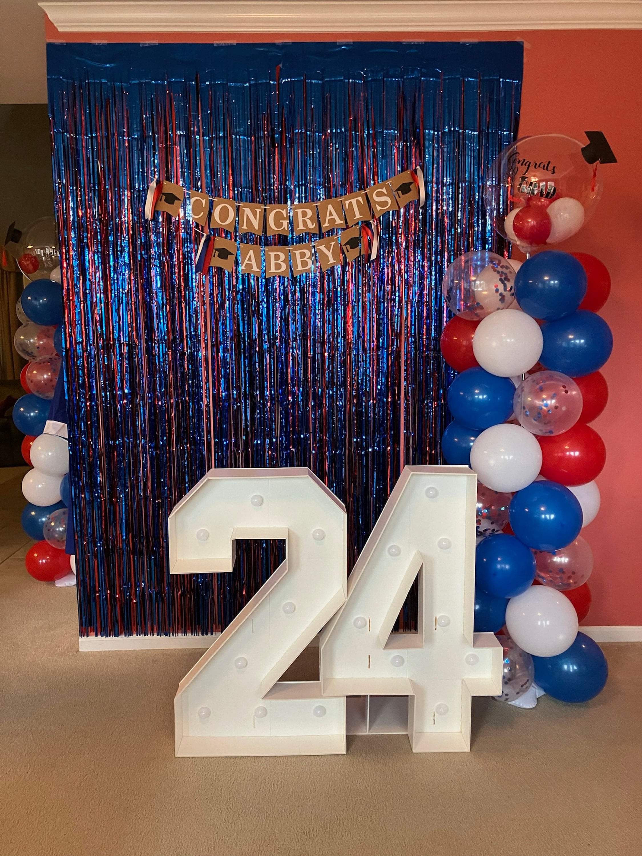 – Die Gesamtbreite des oberen „CONGRATS“-Banners von links nach rechts beträgt, wenn es wie auf dem Bild hängt, ungefähr 4 Fuß.